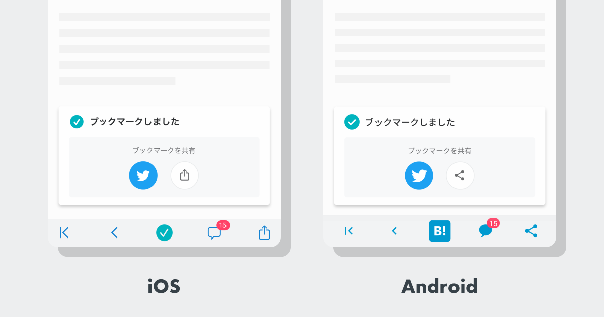はてなブックマークアプリでは、ブックマーク完了後にポップアップにTwitterアイコンと共有アイコンが表示されます。