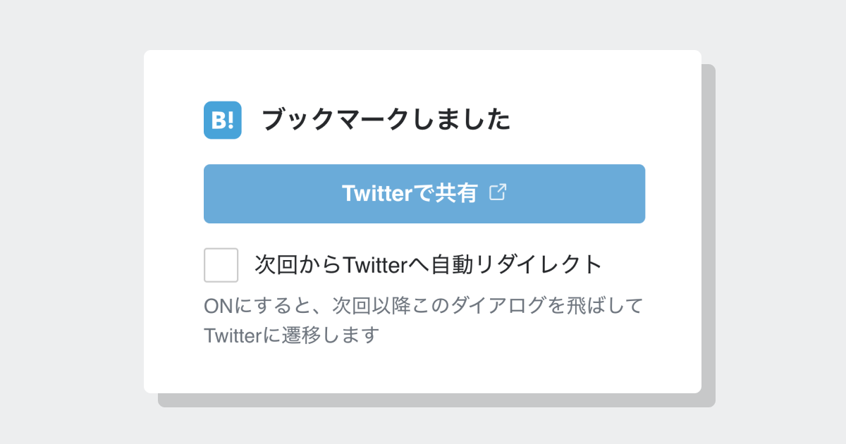このダイアログの表示をスキップし、ブックマーク完了後にそのままTwitterに遷移することも可能です。 ダイアログ内の「Twitterに自動リダイレクトする」オプションをONにすると、次回以降はダイアログの表示をスキップするようになります。
